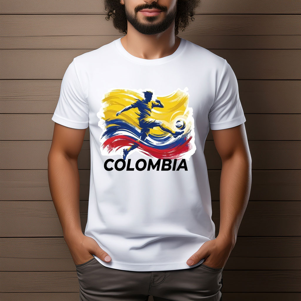 Colombia football fans, World Cup 2026 supporters, soccer lovers, match-day outfits, watch parties, stadium wear, or anyone looking for a bold Colombia soccer shirt that celebrates movement, passion, and the global game.