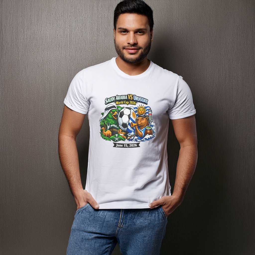 The design features bold matchup lettering with a clear “Go Saudi Arabia” message, creating a confident, fan-forward look that’s perfect for watch parties, stadium wear, or everyday support throughout the tournament.